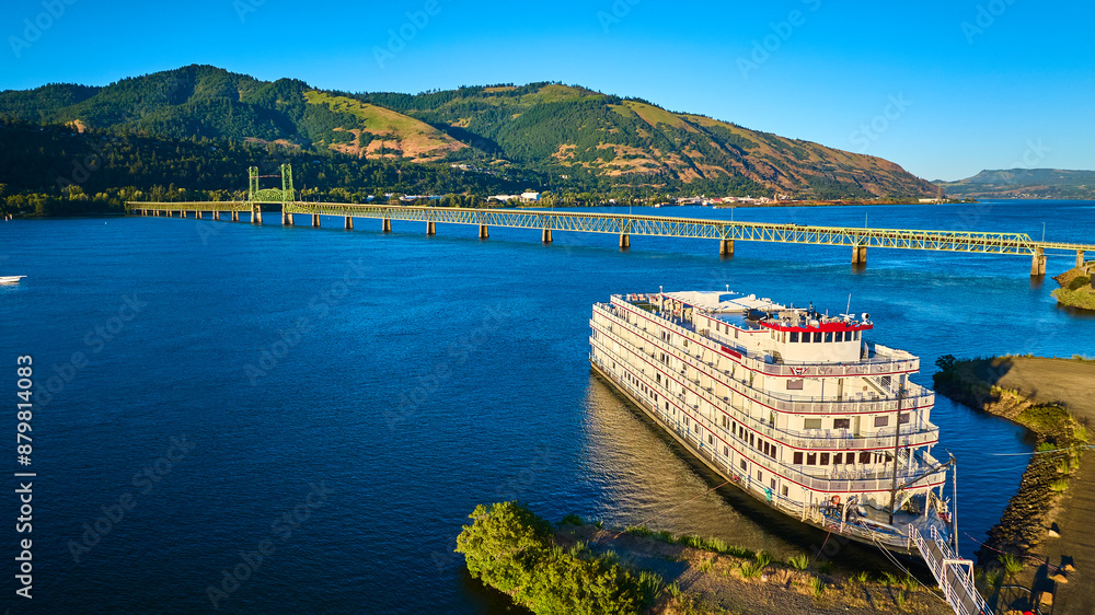 Aerial View of river boat by Hood River Bridge in Columbia Gorge