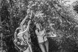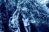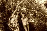 The family hike in nature and enjoys in fresh forest fruit picked directly from the trees.