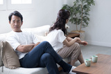 ソファーに座る倦怠期やケンカをする50代夫婦 仲が悪い冷え切った夫婦のイメージ 妻の我儘に疲れた夫