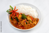 Panang curry over rice isolated on white background.