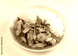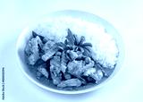 Chicken green curry with coconut shoots over rice isolated on white background.