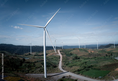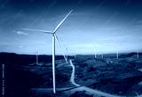 wind turbines situated in a hilly or mountainous area. The turbines are spread out across the landscape, indicating that this is likely a large-scale renewable energy project