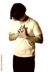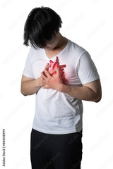 heart disease concept. man pressing on chest with painful expression. severe heartache and having heart attack or painful cramps.