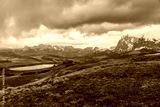 Panoramic view of the Langkofel Group from Seiser Alm in the Dolomites in South Tyrol, Italy.