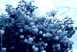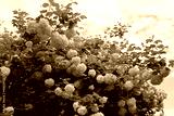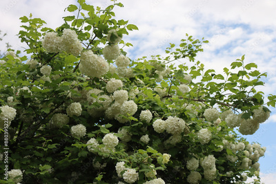 Viburnum opulus with many white flowers on springtime. Snowball bush in the garden against blue sky with cloud