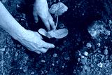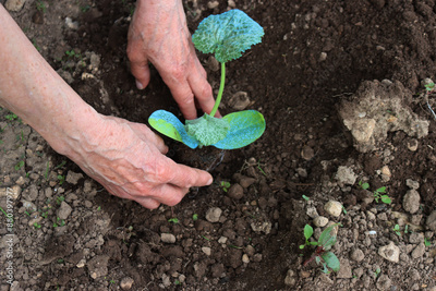 Detail of female hands transplanting Zucchini plants in the vegetable garden