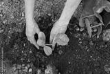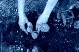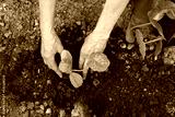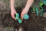 Detail of female hands transplanting Zucchini plants in the vegetable garden