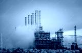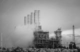 Industrial oil refinery plant with multiple tall smokestacks emitting smoke or steam. The plant has a complex network of pipes and structures is power industry concept.
