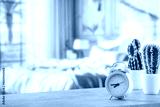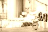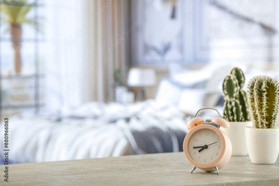 Alarm clock on wooden table top. Blurred background of bright bedroom with bed in cozy home interior. Fresh early morning and table with copy space for products. Montage product display.