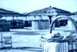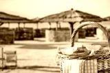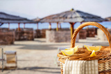 Wicker basket and fresh cut lemons on sand on a beach with beach and seascape background. Copy space for products. Summer picninc on a beach.