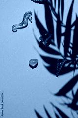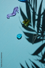 Marine transparent colorful figurines or kid's toys on the blue background with tropical palm leaves shadows. Summer sea vacation concept composition. Copy space