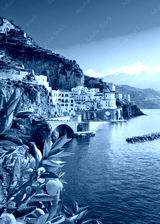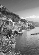Beautiful view of Amalfi on the Mediterranean coast with lemons in the foreground, Italy