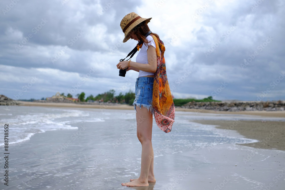 Summer beach background. Portrait young Asian woman with a white shirt in vacation travel holiday