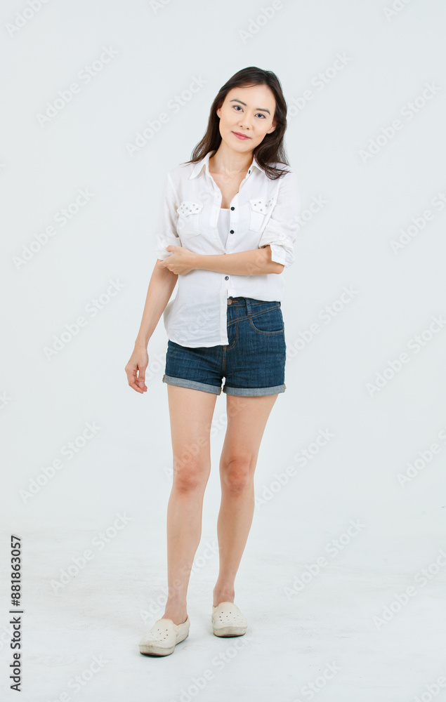Asian woman beautiful confident wearing white top shirt casual clothes and shorts jean, standing posing on isolated over white background studio, Portrait of pretty girl. Lifestyle concept.