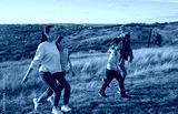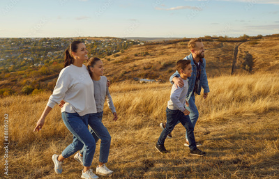Happy family enjoying nature walking holding hands in outdoor trip, spending weekend holiday together, parents, child enjoy. Countryside inspiring vacation, resting or recreation activity, adventure