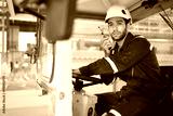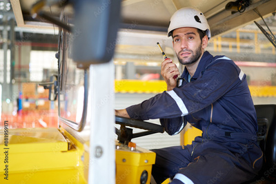 Engineer or worker talking on walkie talkie and driving a car in the factory
