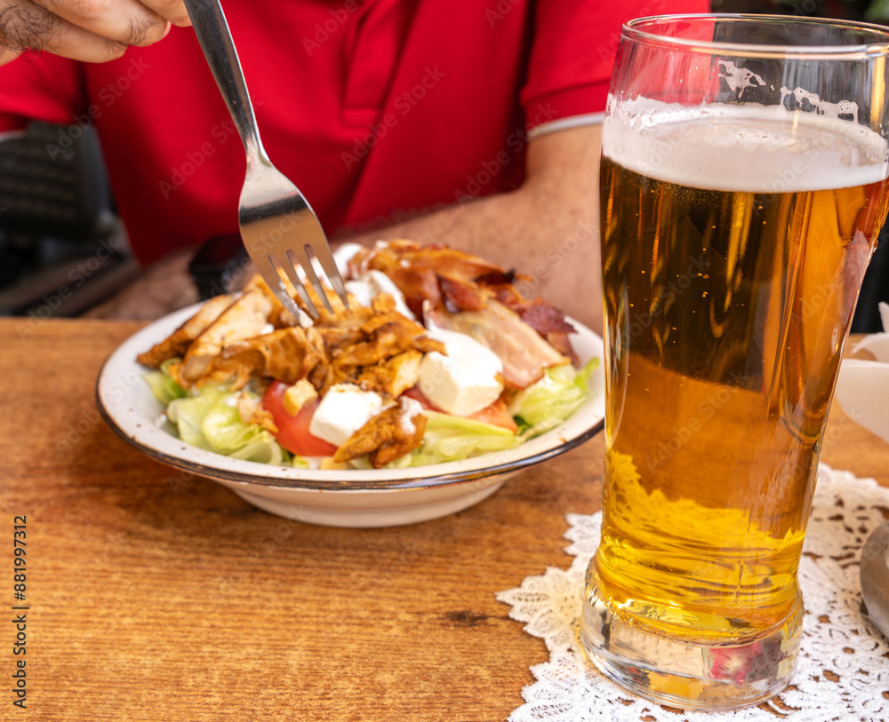 Polish Caesar salad with chicken, bacon and vegetables, high-calorie meat salad with fresh vegetables