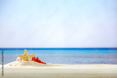 Star fish on sand and beach and sea and sky background. Copy space for products and objects.