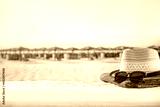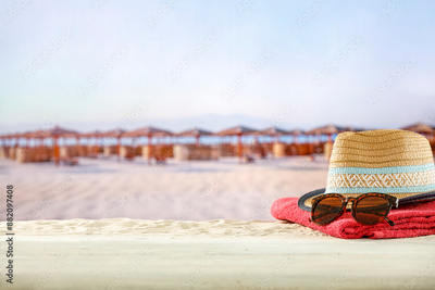 Straw summer hat and sunglasses on a table with tropical summer holidays beach background. Copy space for products and objects and summer stuff.