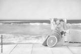 Large pitcher of lemonade cold drink with orange and ice and mint leaves on wooden table with sea background. Copy space for products.