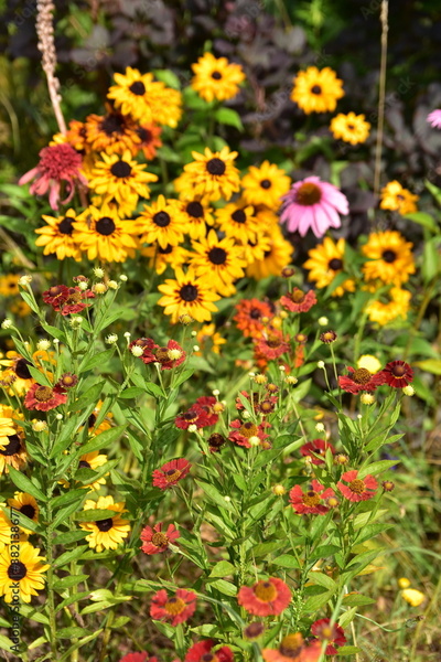 Blooming summer flowers, lilies, echinacea, rudbeckia in the garden on a summer bed, on a bright, warm day.