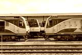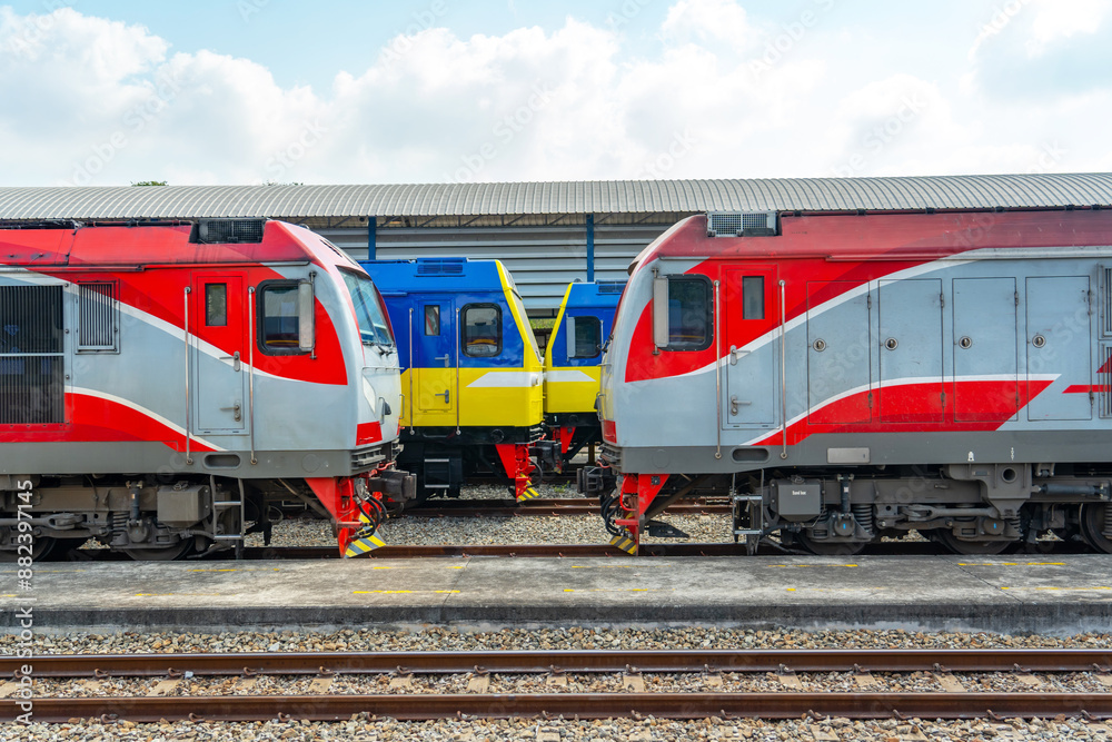 Head locomotive side view of the station platform and commuter train in the parking lot