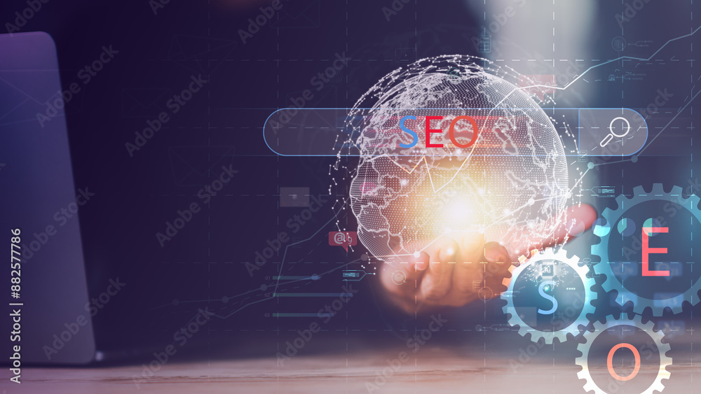 entrepreneur showing SEO concept ,optimization analysis tools , search engine rankings ,social media sites based on results analysis data ,Website Search Optimization ,nteresting web rankings