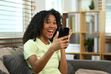 Oh no! Really?. Shocked young Afro woman looking at mobile phone, received unexpected message.