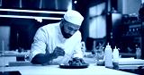 Man, chef and serious with food in kitchen at restaurant for fine dining, meal and creativity. Male employee, professional and cooker with pride for culinarily, hospitality and catering service