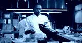 Black man, chef and fire with frying pan in kitchen at restaurant for fine dining, meal and creativity. Employee, professional and cook with food for culinary, hospitality and catering service