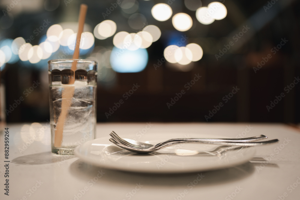 Tableware set with white ceramics dish silver forks and spoon prepare for elegance meal with a glass of cold water