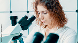 young female student in the laboratory working with a microscope