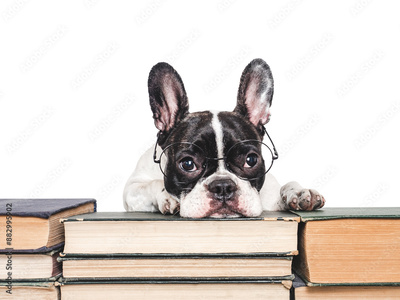 Cute puppy and old books. Close-up, indoors, studio shot. Isolated background. Concept of care, education, obedience training and raising of pets