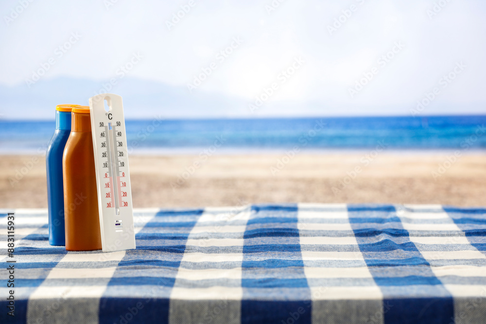 Sunscreen oil cream containers on checkered tablecloth summer table with beach and sea background. Empty copy space for montage products display.