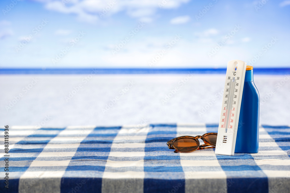 Sunscreen oil cream containers on checkered tablecloth summer table with beach and sea background. Empty copy space for montage products display.