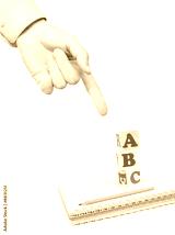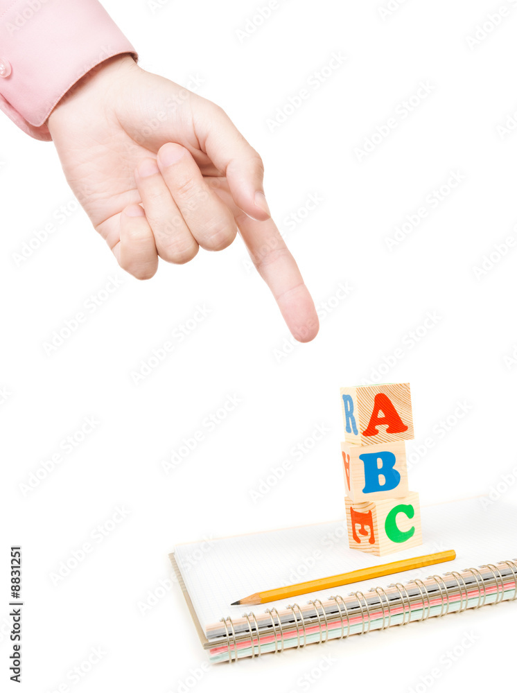 concept with hand of teacher color alphabet and notebook isolated on white background