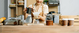 Asian barista brewing fresh espresso. Enjoy a cozy, trendy cafe experience with high quality beans in home or cafe