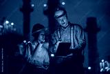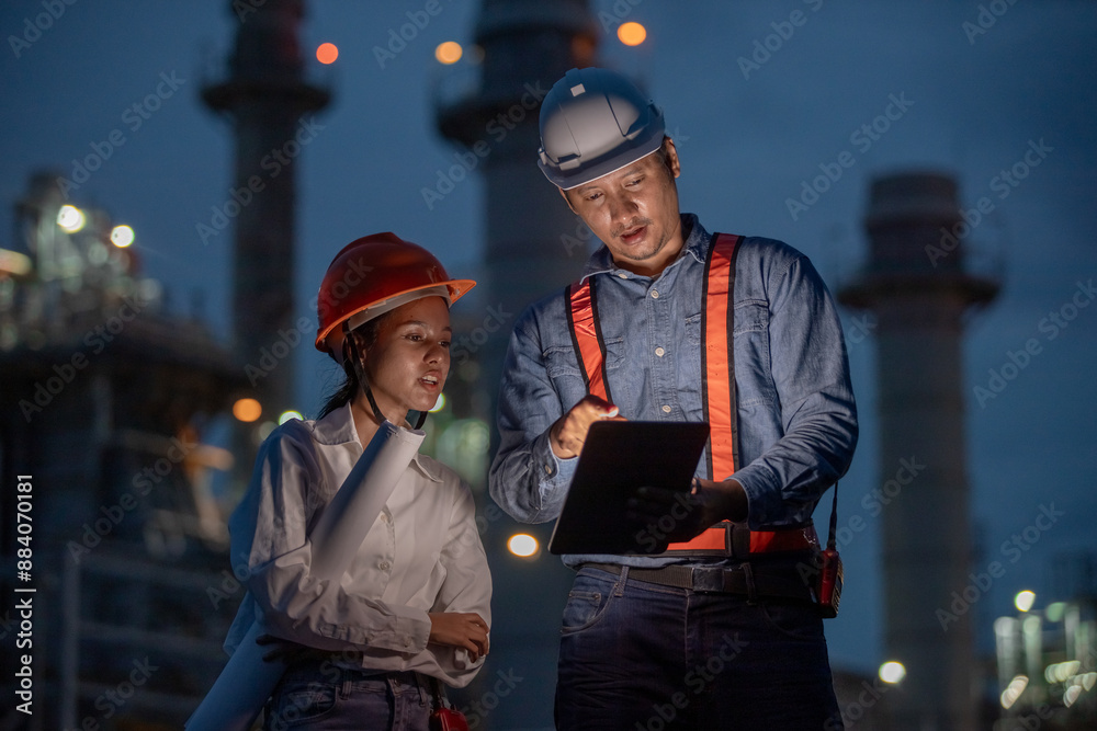 Asian team man and women engineer working at nighttime with blueprint standing at front of Oil-fired power plant. Worker wear uniform helmet working tower power plant construction.