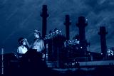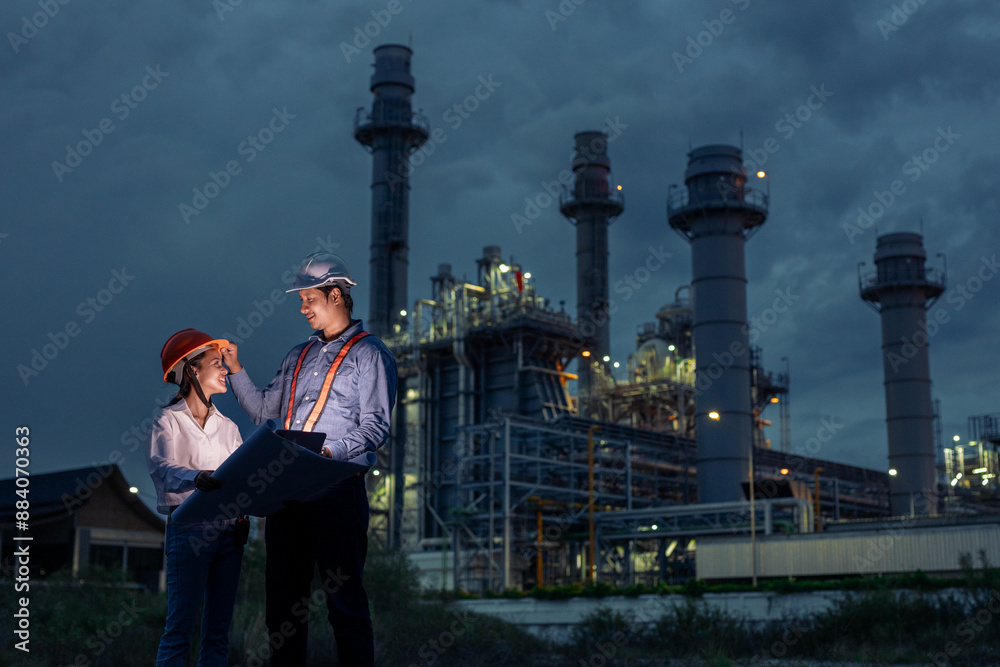 Asian team man and women engineer working at nighttime with blueprint standing at front of Oil-fired power plant. Worker wear uniform helmet working tower power plant construction.
