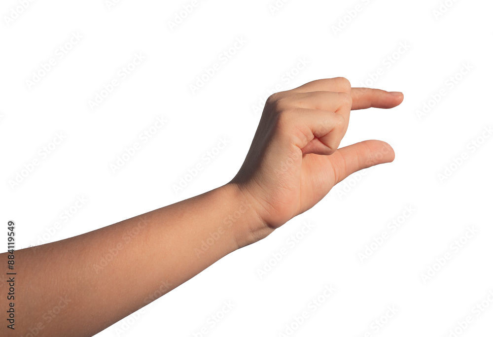 Childs hand holding something invisible little, small thing between two fingers, isolated on white background., transparent PNG