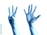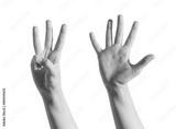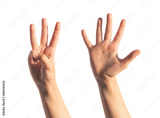 Kids hand counting three and five with little fingers isolated. Gestures for quantity, white background.