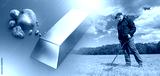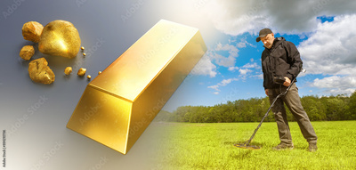 Search for golden treasure. Man is treasure hunter. Guy with metal detector on lawn. Bar of gold on gray. Man is looking for treasure underground. Using metal detector to find buried gold