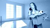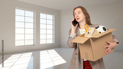 Woman moving to new home. Girl with box in empty room. Lady is relocating to empty apartment. Moving box with personal belongings. Woman calls moving company. Businesswoman talking on phone