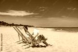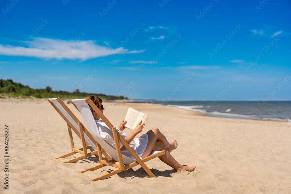 Summer holidays on beach. Woman of European beauty in white shirt reading book sitting on deckchair on beach with white sand on beautiful sunny day. Relaxing on beach. Side view