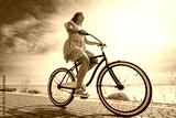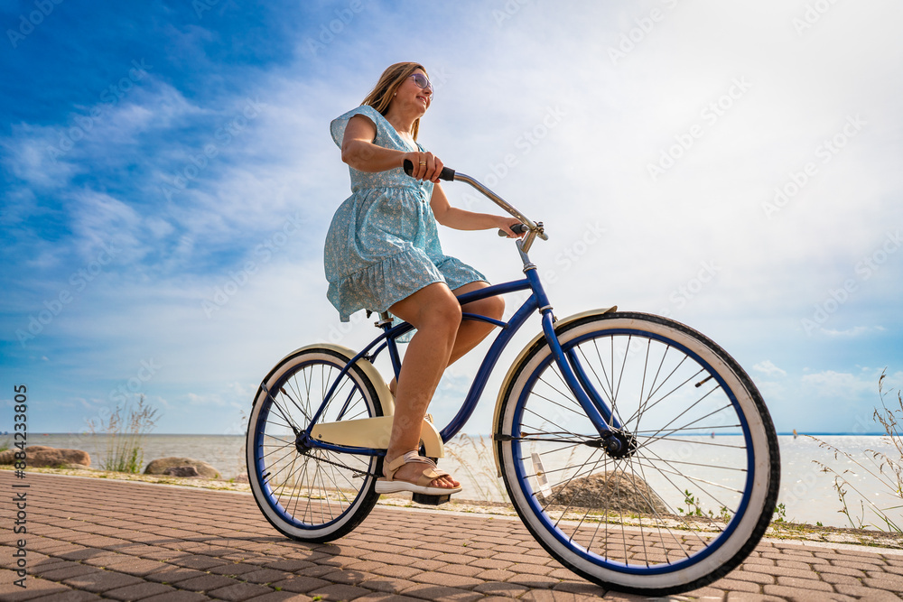 Active summer holidays. Woman with long hair wearing blue dress riding blue cruiser bike on bicycle path on seafront on sunny day. Side view