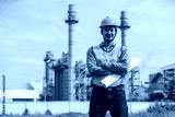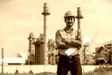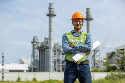 Portrait of asian worker power plant factory holding blueprint thumb up and smiling. Engineer wearing safety uniform helmet. man electrical generator repair operations. electrician energy industry