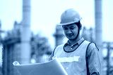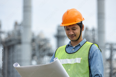 Portrait of asian worker power plant factory holding blueprint thumb up and smiling. Engineer wearing safety uniform helmet. man electrical generator repair operations. electrician energy industry
