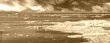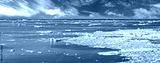 Iceberg, seascape or ocean in Arctic for view, nature and day in Greenland. Global warming awareness, melting ice and climate change on Earth with landscape, broken glacier and frozen water on banner