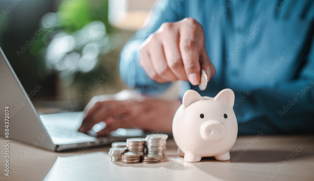tax, budget, deposit, stack, currency, piggy bank, coin, future, insurance, invest. A person is putting coins into a piggy bank. Concept of saving money and being financially responsible.
