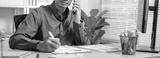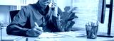 contract, document, executive, job, manager, occupation, smartphone, paperwork, working, reading. A man is talking on his cell phone while writing with a pen. He is sitting with a computer monitor.